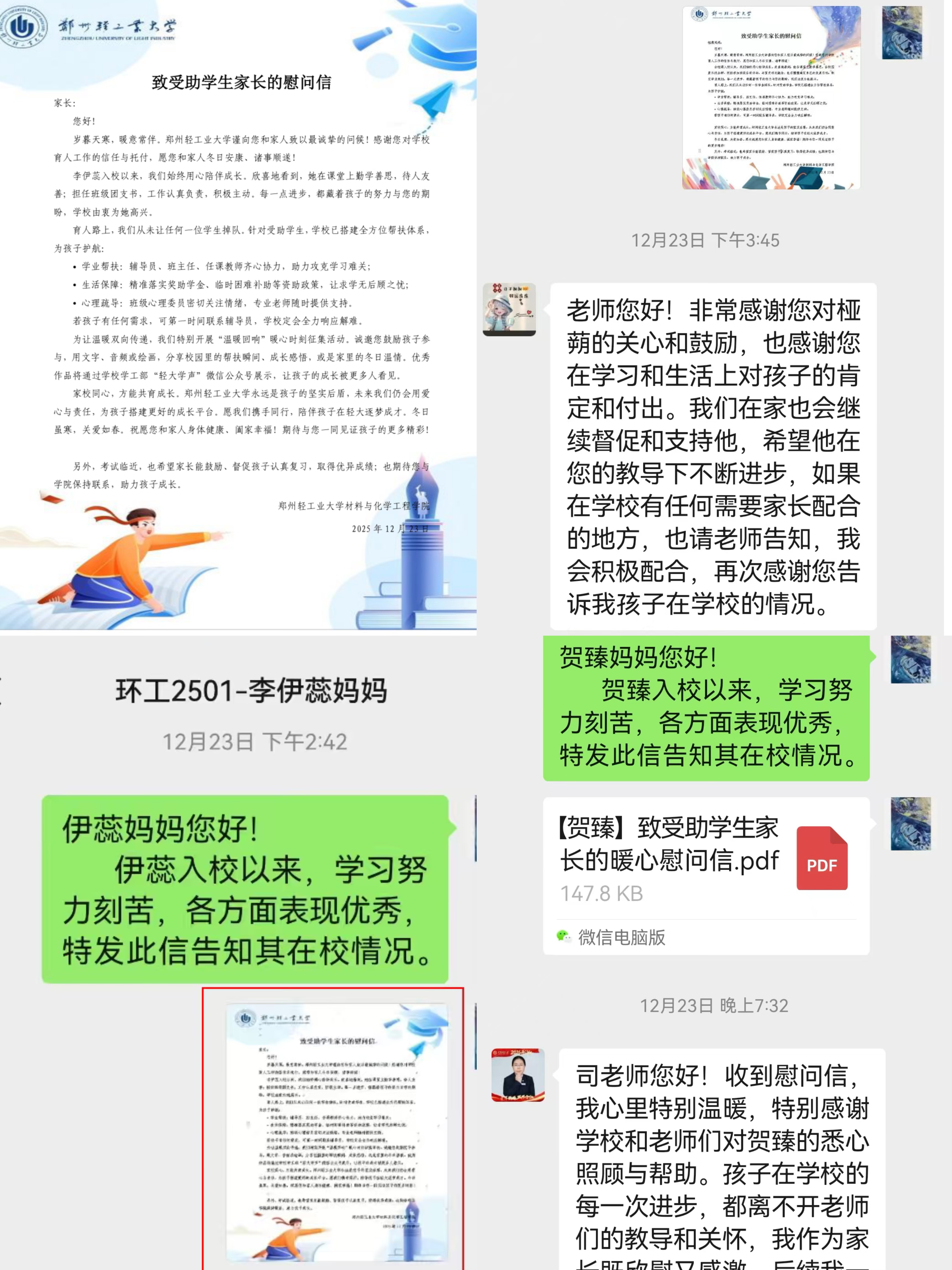 “见字如晤” 温情信笺活动中,辅导员们为受助学生家长制作专属信笺。信中既有对学子不畏困境、勤学奋进的肯定,更有对未来逐梦之路的期许与鼓励。家长收到信后,纷纷通过微信、电话向老师表达谢意:“非常感谢您对孩子的关心和鼓励,也感谢您在学习和生活上对孩子的肯定和付出”。纸短情长间,不仅搭建起大发彩票 与学子的精神纽带,更收获了家校间的双向奔赴与信任。